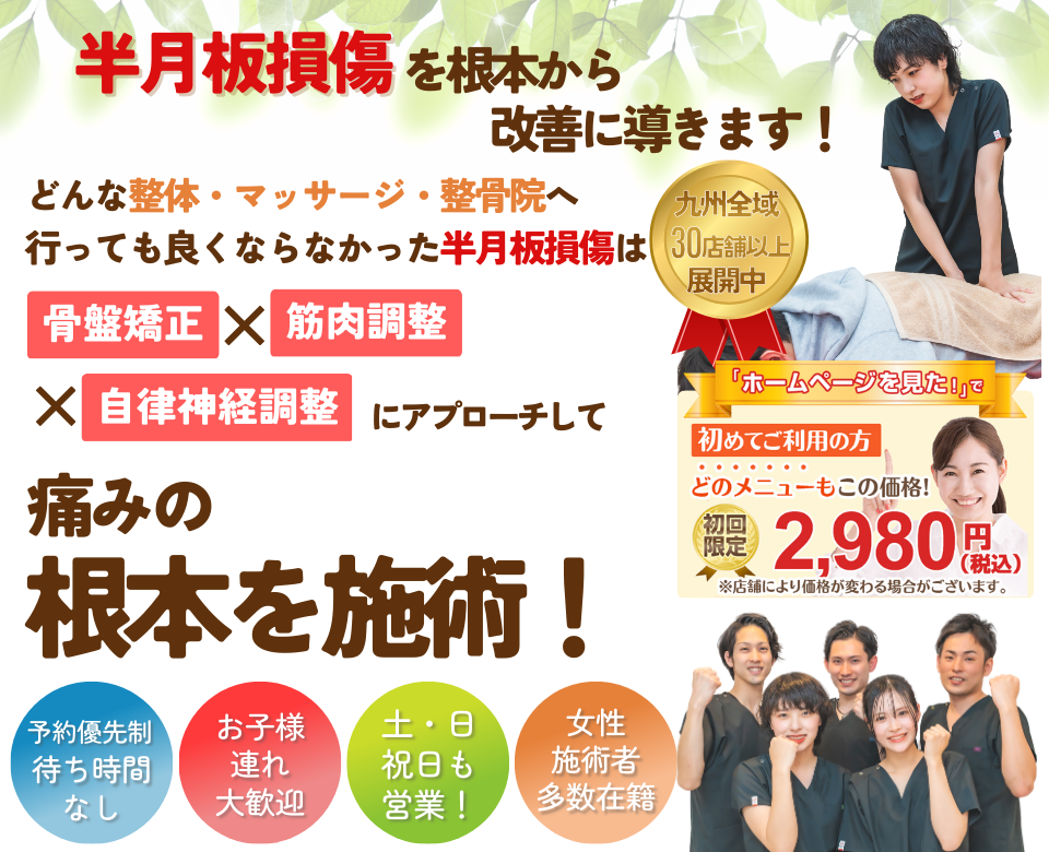 半月板は膝関節のクッション材になりますので発症後は荷重を控える事が炎症を早期に抑える大事な選択の1つとなります。階段や上り坂・下り坂の様な場所はなるべく控えるのが最良です。理想としては松葉杖を使用して、荷重がかからない様にすることが望ましくなります。荷重痛がなくなった段階で、関節可動域の向上及び周囲筋肉の強化が必要となります。その後スポーツ・日常復帰ではサポーター及びテーピングを使用して負荷がかからないようにしていくことが必要となってきます。