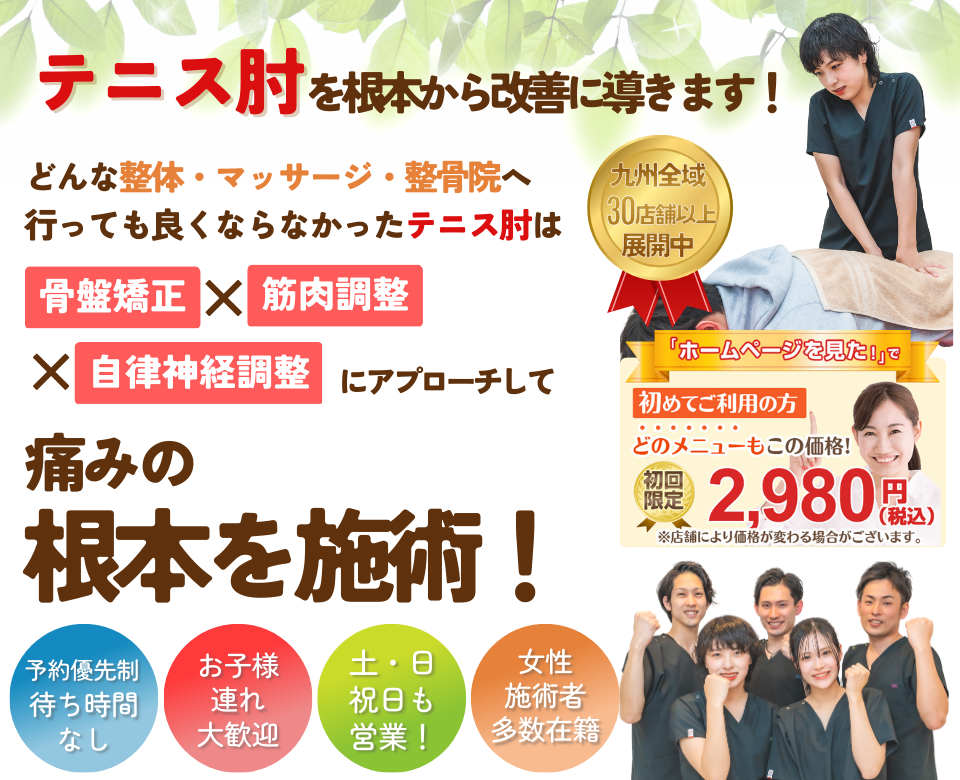 テニス肘の施術では、一般的には保存療法が用いられます。患部の安静、テニス肘バンドの装着、日常生活指導、ストレッチ、ステロイド注射などが用いられ、多くが6か月以内に軽減します。難治性の場合は、手術を選択することもあります。