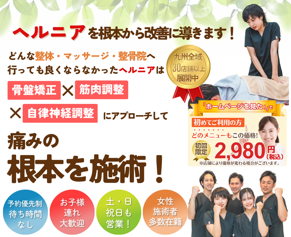 日常生活で腰にかかる負担が大きかったり、筋力の低下により内臓を支えられないため圧迫されることや、腰回り臀部、足の筋肉が硬い、骨盤のゆがみ、姿勢の乱れなどによって起こるため、なかなか改善することが難しいのがこの「ヘルニア」。