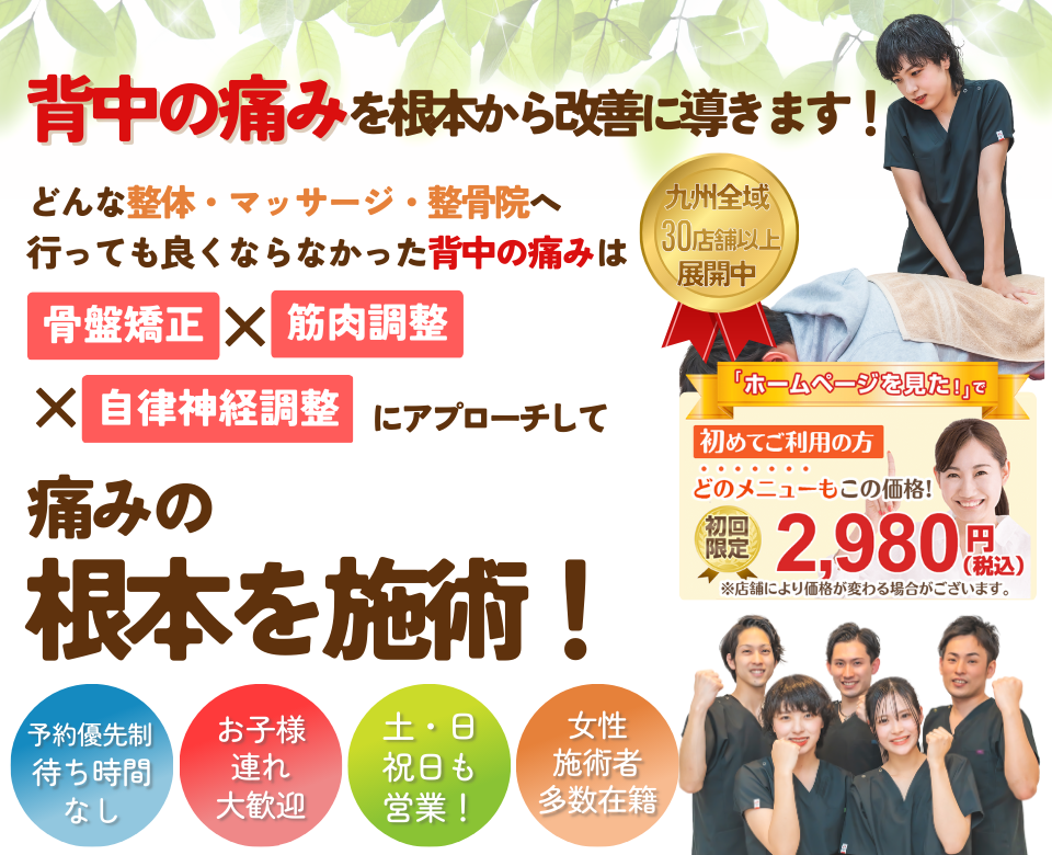 筋肉の硬さだけが原因であれば、マッサージやストレッチなどで改善しますが、背中の痛みの大半が背骨・骨盤の歪み、姿勢不良が原因で筋肉にストレスをかけ続けていることが原因で起こっています。つまり、根本的な原因が解決されないと背中の痛みの改善はされません。