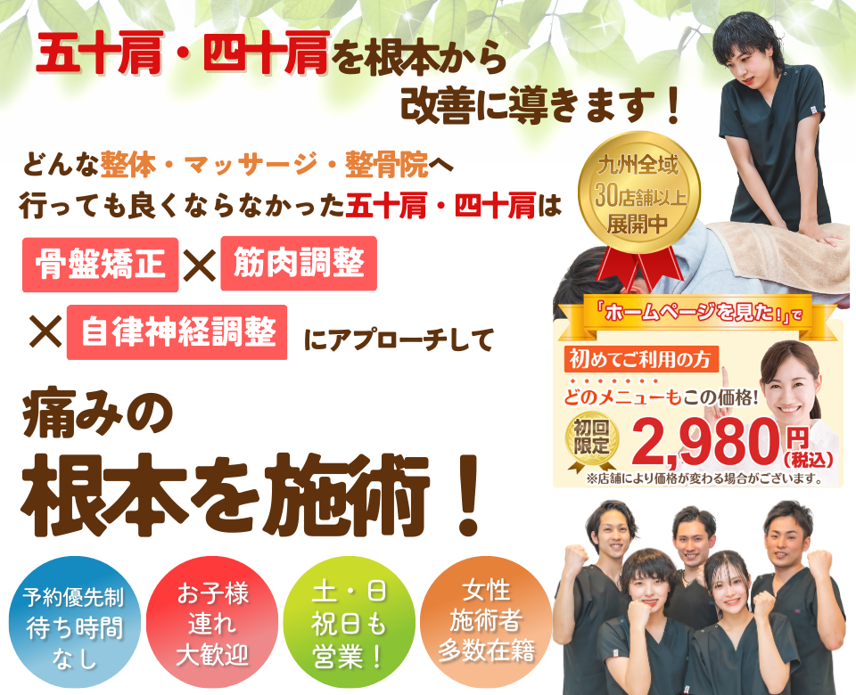 五十肩・四十肩は50歳代を中心とした中高年以降に、明らかな原因がなく肩の痛みと可動域制限が見られる疾患のことです。