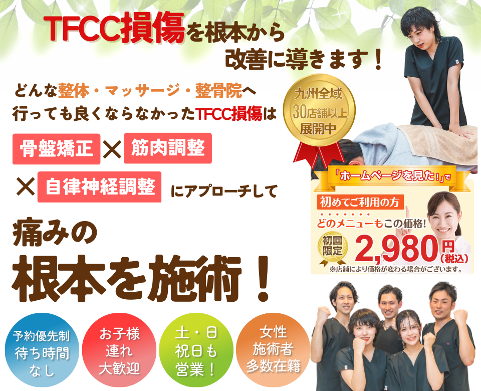 TFCCとは、正式名称を「三角線維軟骨複合体(Triangular FibroCartilage Complex:TFCC)」といいます。三角線維軟骨はTFCCの先にある手根骨という複数の骨を支えるクッションの役割を持っています。そのクッションが手を着くなどの外傷によって損傷し、手首を動かすたびに痛みが起こるのです。